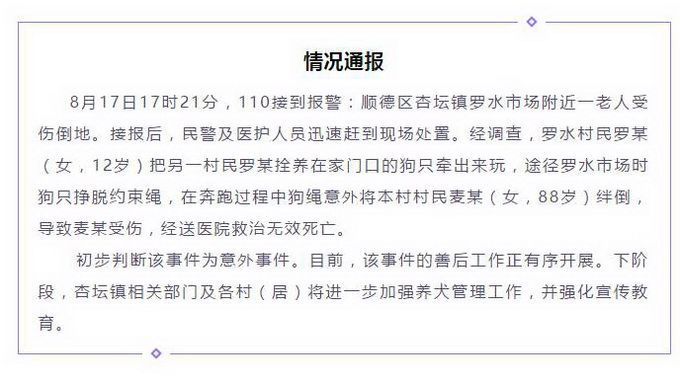 8月17日17时21分,110接到报警:广东省佛山市顺德区杏坛镇罗水市场附近一老人受伤倒地。接报后,民警及医护人员迅速赶到现场处置。经调查,罗水村民罗某(女,12岁)把另一村民罗某拴养在家门口的狗只牵出来玩,途径罗水市场时狗只挣脱约束绳,在奔跑过程中狗绳意外将本村村民麦某(女,88岁)绊倒,导致麦某受伤,经送医院救治无效死亡。