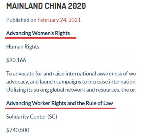 “美国国家民主基金会”2月24日在其官网上公布了他们在2020年各地区的活动经费,其中针对中国香港、内地、新疆和西藏这4个中国的地区,设置了包括“女性权利”、“宗教自由”、“人权”.......数十个项目,总计投入了1000多万美元。