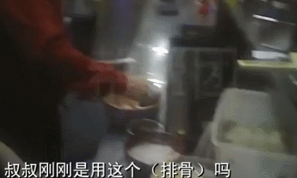店员将吃剩排骨放进顾客的粥里