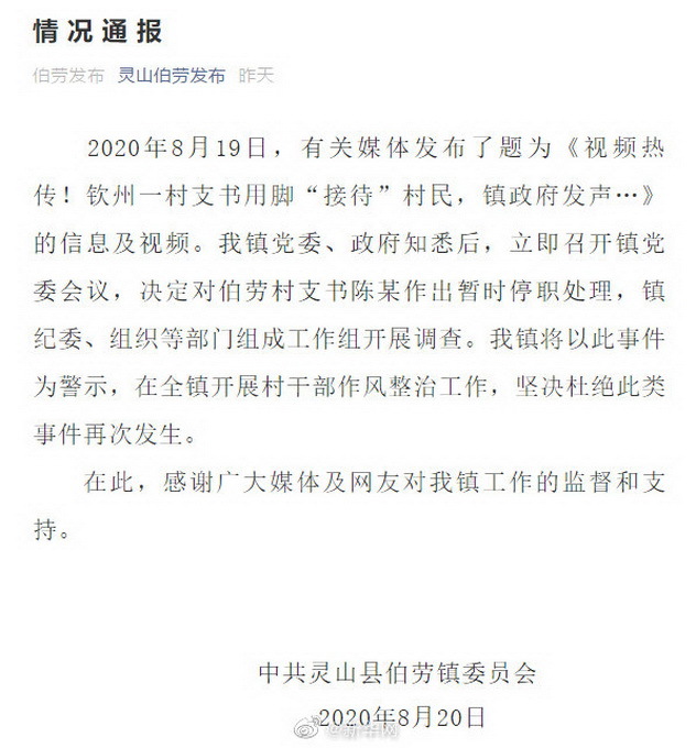 8月20日,广西钦州灵山县伯劳镇官方微信公众号“灵山伯劳发布”发布消息:2020年8月19日,有关媒体发布了题为《视频热传!钦州一村支书用脚“接待”村民,镇政府发声…》的信息及视频。伯劳镇党委、政府知悉后,立即召开镇党委会议,决定对伯劳村支书陈某作出暂时停职处理,镇纪委、组织等部门组成工作组开展调查。