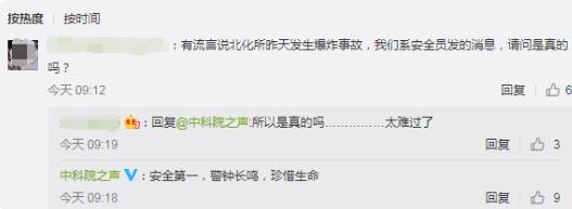 另有网友在中科院官网微博“中科院之声”的一条微博下询问此事,官微对此回复称“安全第一,警钟长鸣,珍惜生命”。