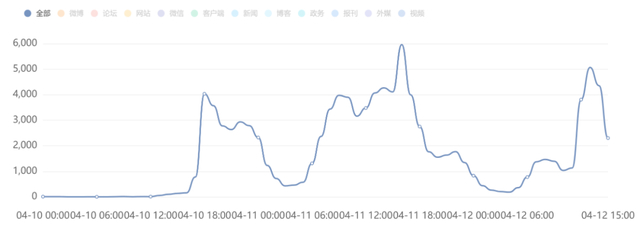 截至4月12日15时,相关舆情信息总量共计103967条,其中,微博44680条,客户端43117条,微信709条,网站4083条,新闻3300条,视频7721条,论坛344条,报刊9条,外媒1条,政务3条。