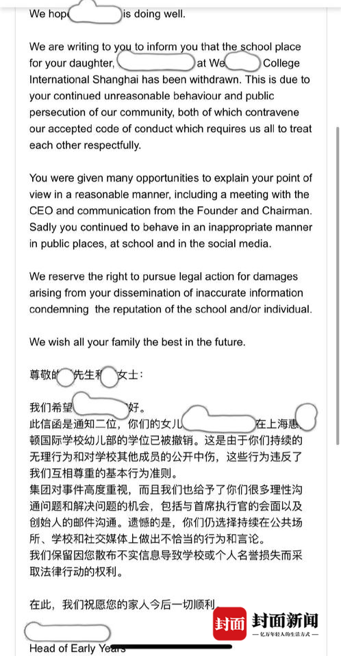 然而,当天下午4点48分,D女士收到了学校的邮件通知,校方表示由于“D女士夫妇持续的无理行为和对学校其他成员的公开重伤,小天在上海惠灵顿外籍人员子女学校的学位已被撤销。”