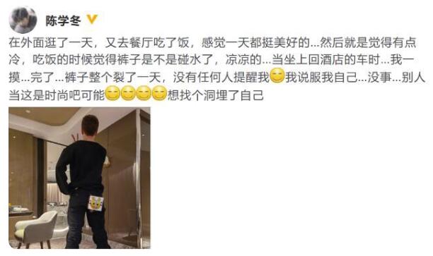 4月26日,陈学冬在个人社交平台分享了自己的爆笑社死现场,发文称:“我说服我自己…没事…别人当这是时尚吧可能,想找个洞埋了自己。”还附上了自己裤子裂了的背影照,裂的地方用表情包打了码。