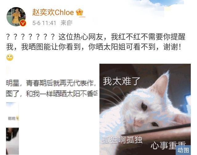 这条动态恰巧被赵奕欢看到,她也公开发文翻白眼怒怼这位网友,她连发多个问号,称:“这位热心网友,我红不红不需要你提醒我,我晒图能让你看到,你晒太阳姐可看不到,谢谢!”