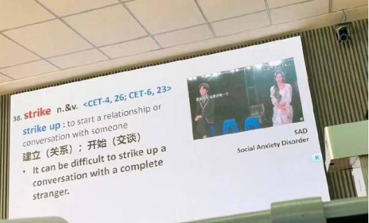 近日,有网友晒出自己英语课的课件。在解释单词strike的意思时,老师使用了此前孟美岐和李云迪在活动上彼此回避,不敢互动的表情包作配图。没想到这个社恐现场,还有如此精彩的后续,网友纷纷表示“哈哈哈哈又学会个新单词”。