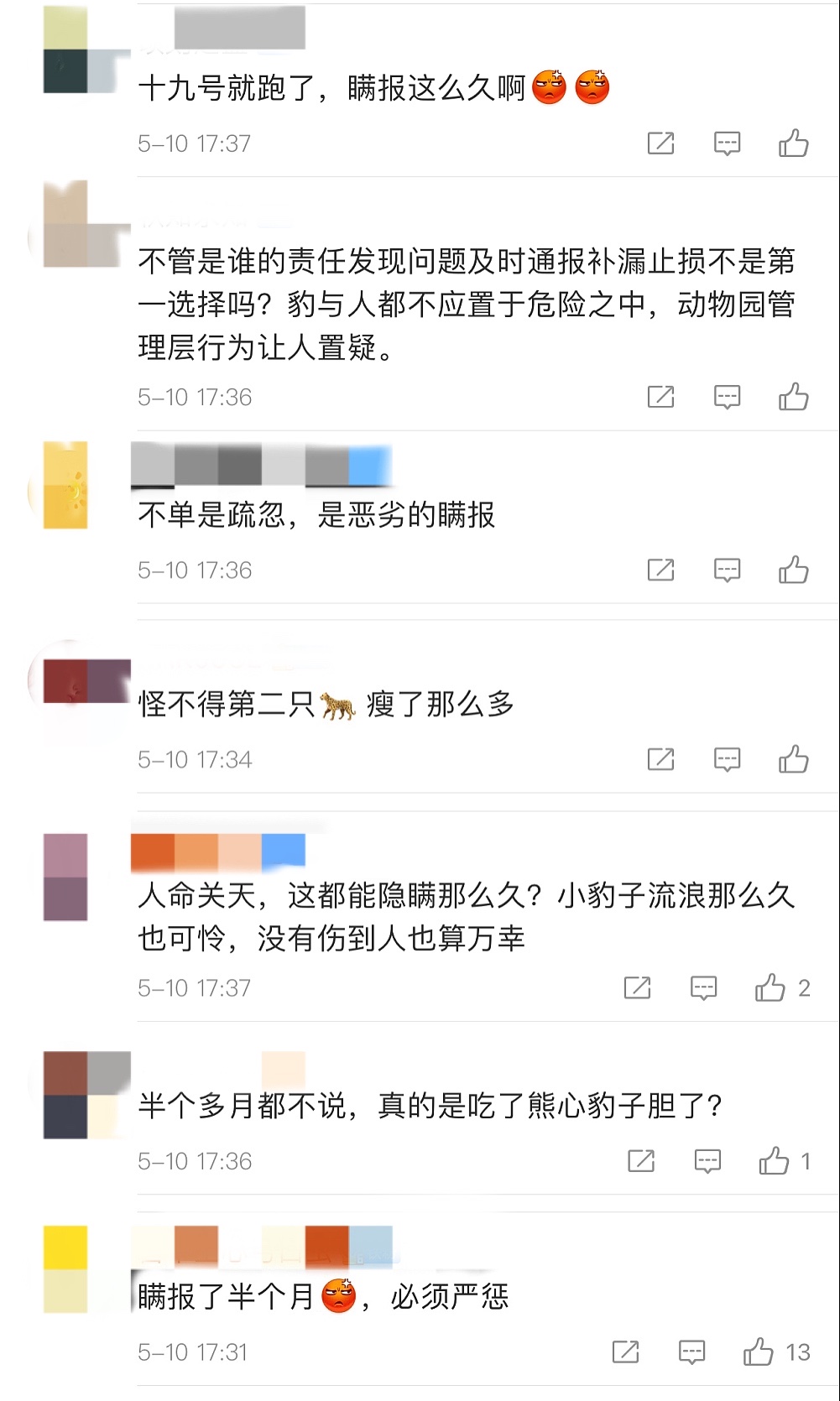 反转反转再反转,丢豹又“瞒豹”惹众怒。从“有网民5月1日发现豹子身影”到“动物园否认有动物逃逸”再到“3只金钱豹4月19日就已外逃”……杭州野生动物世界“遇事先捂盖子,再三扯谎逃避”的行为引发网民不满。5月10日18时的舆情监测显示,“发怒”图片成为网民评论时最常用的表情。网民认为,这样严重的瞒报行为不仅未能减轻大家的担忧,反而推高了恐慌和不信任感,“回应反反复复又含含糊糊,一会儿一个样”“‘瞒豹’还没找到,我们已经被瞒报吓到”“到底是谁在参与隐瞒”“动物园会撒谎,但金钱豹却不会隐身”。