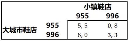 - 而如果一家店选择了996而另一家店选择了955,那么996鞋店最终可能会独占市场,而955鞋店会没生意,于是两家的收益可假设为8, 0。