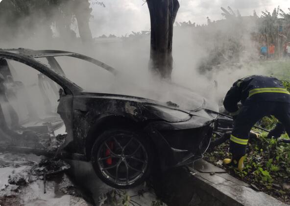 又双叒!广州一特斯拉撞树后自燃,现场画面曝光惨不忍睹【图】