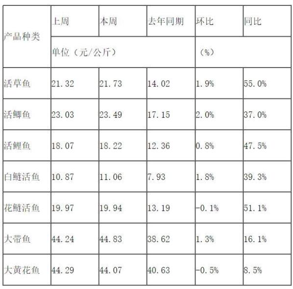 从同比看,除了大带鱼、大黄花鱼,其他鱼种同比均大幅上涨。如,草鱼周平均价格21.73元/公斤,同比上涨55.0%;花鲢鱼周平均价格19.94元/公斤,同比上涨51.1%;鲤鱼周平均价格18.22元/公斤,同比上涨47.5%。