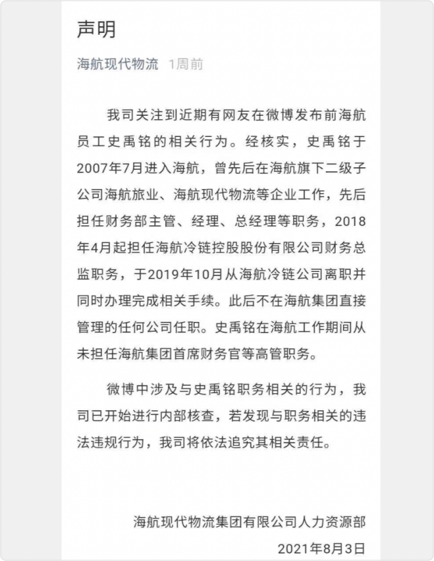 针对赵女士微博上举报的情况,8月3日,海航现代物流发布声明称:公司关注到前海航员工史禹铭的相关行为,将内部核查、追责。