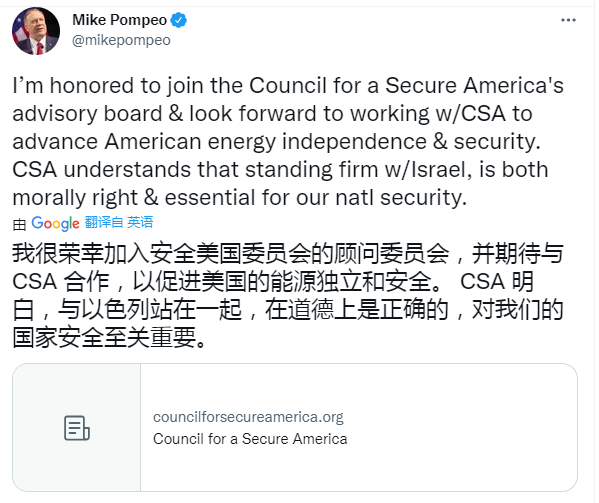蓬佩奥在推特上也高调宣示,“CSA 明白,与以色列站在一起,在道德上是正确的,对我们的国家安全至关重要。”