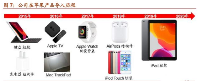 当然领益智造都提到了,就不能不提比亚迪了,比亚迪为苹果提供,下图是招商电子整理的比亚迪导入苹果供应链的各个产品历程。最开始是从键盘组装和充电器之类的开始,然后开始组装AppleTV,以及笔记本的结构件,最近的一个大成就是开始组装ipad。