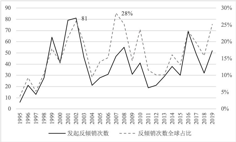 印度反倾销次数及全球占比折线图