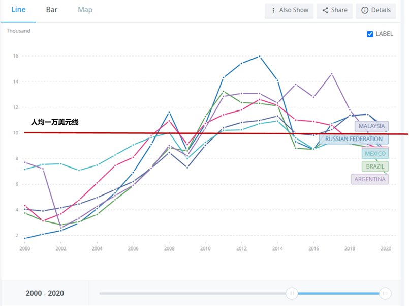 马来西亚,2011年就首次突破了一万美元达到10399.4美元,然而到2019年也只有11432.8美元,2020年受疫情影响只有10412.3美元。
