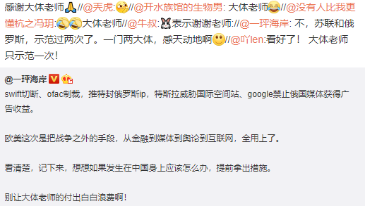 倒是国内不少网友,前两天把俄国当做神兵天将,现在又心里打鼓觉得俄国人是不是不行了,我看也没必要入戏太深。俄国和乌克兰的冲突毕竟是外域之事,但这也是个提醒。未来,我国如果直面和西方的冲突,更应该有信心有定力,不要前二十四小时狂热,后二十四小时畏惧,一惊一乍的。