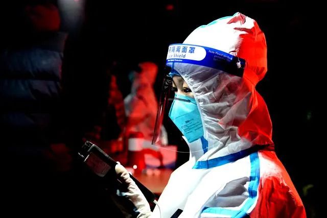 3月13日凌晨,上海市松江区洞泾镇社区卫生服务中心医护人员进行核酸采样扫码登记。图源:新华社