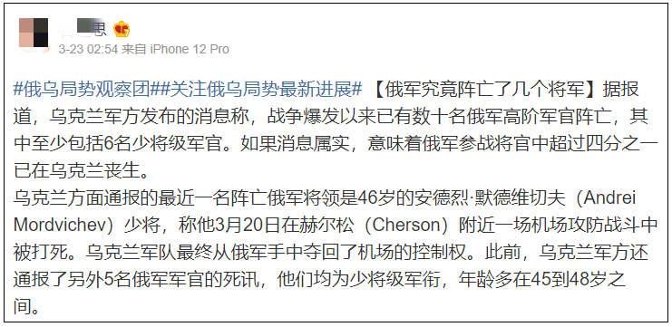 但是,中国网络上一些亲西方媒体人哪里管这些啊,不加验证的就开始到处宣传俄军损失惨重,快不行了!此外,还有一个比较大的谣言:俄乌战争爆发以来,已有数十名俄军高阶军官阵亡,其中至少包括6名少将级军官。但是,我们没有看到任何的照片或视频作证,而俄军只公布了一名副指挥员阵亡,其他的都没有办法证实。