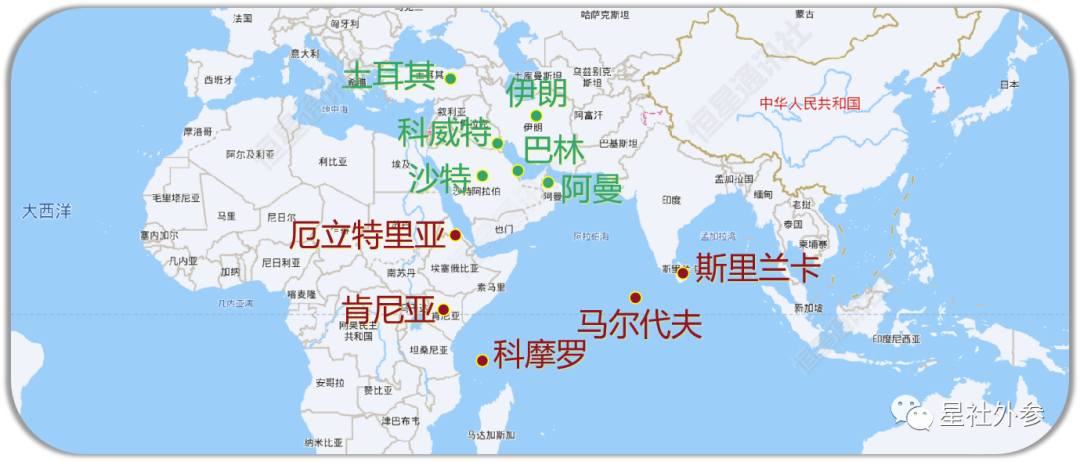 上面这张图,是王国委兼外长三月份工作涉及的国家分布示意图,图中: