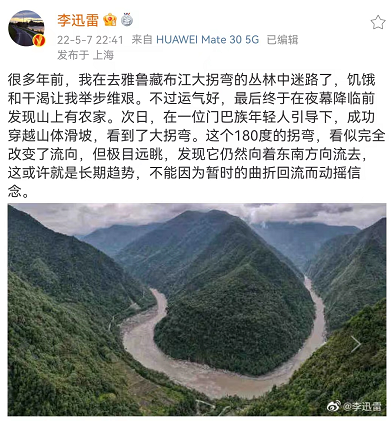如在描述云雾缠绕的湖景时,李迅雷讲到“一年之计在于春,春天已过,2022年,留给我们的时间已经不多了”;又如在回忆雅鲁藏布江大拐弯的丛林时,感叹“这个180度的拐弯,看似完全改变了流向,但极目远眺,发现它仍然向着东南方向流去,这或许就是长期趋势,不能因为暂时的曲折回流而动摇信念”,似乎话里有话,欲言又止。