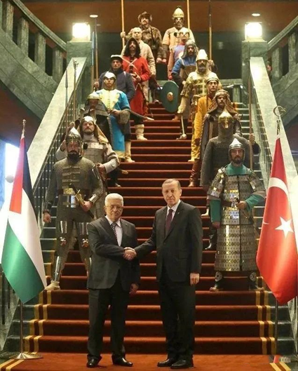 2015年埃尔多安会见阿巴斯,特地安排了16名武士站在背后,代指历史上的16个能与突厥人扯上关系的政权,分别是:匈奴、西匈奴、匈人帝国、白匈奴、突厥汗国、阿瓦尔帝国、可萨帝国、回鹘汗国、喀喇汗国、伽色尼王国、塞尔柱帝国、花剌子模、金帐汗国、帖木儿帝国、莫卧儿帝国、奥斯曼帝国。