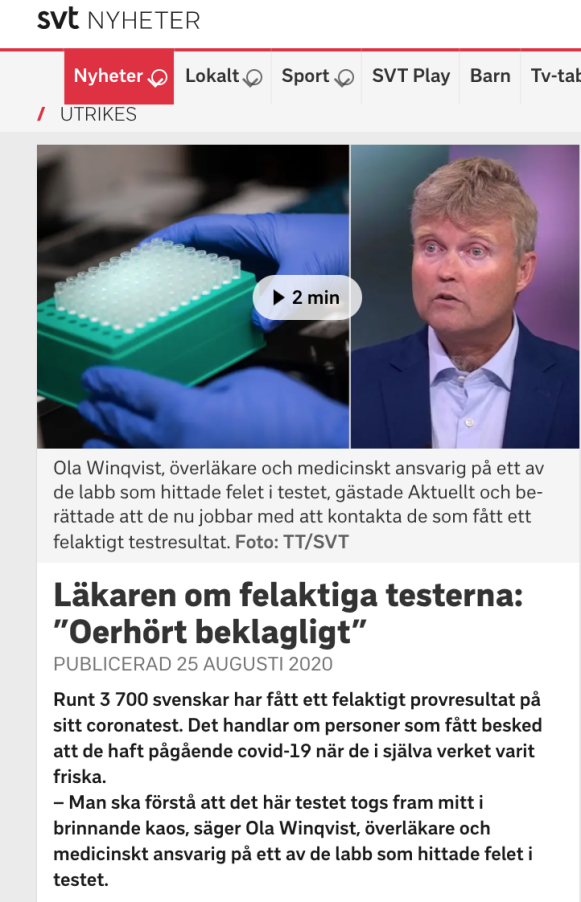8月27日,瑞典公共卫生局在其网站上发布了一篇文章《错误的测试结果导致大约3700个新冠肺炎确诊数据》。