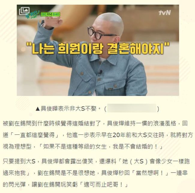 视频中,主持人问他什么时候觉得这婚结对了?具俊晔马上回应“一直都这样觉得”,称二十多年前与大S交往时,就将她视为结婚对象:“如果不是这种等级的女生,我是不会结婚的。”