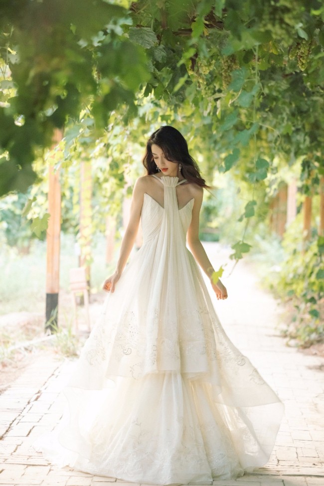 4日,一组Angelababy新照曝光。她身穿白色长裙,微卷长发披肩,在仲夏之景中散发女神光芒。