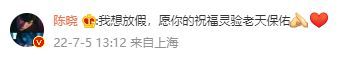 随后,陈晓在评论区回复陈妍希道:“我想放假,愿你的祝福灵验老天保佑!”