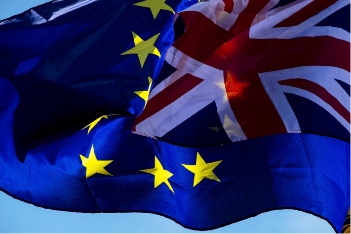 2019年10月19日在英国伦敦议会大厦外拍摄的欧盟旗帜与英国国旗。图|新华社