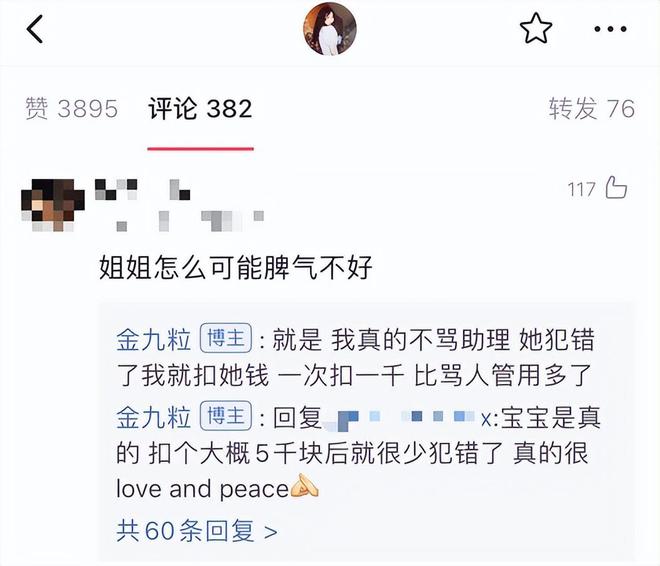 原来有人曝出金婧私底下的个性其实并非是像银幕上所呈现出来的那样,甚至于传她经常打骂助理。金婧本人出面辟谣,在下方回复粉丝留言称:我真的不骂助理,她犯错了我就扣她钱,一次扣一千,比骂人管用多了。
