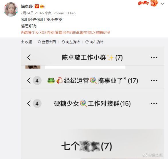 陈卓璇则简单晒出微信群群名的截图,表示“我们还是我们,我还是我,感恩所有”。