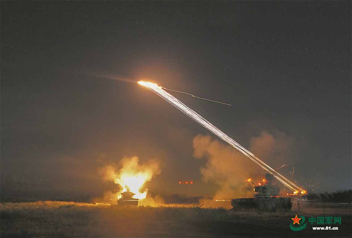 防空高炮夜间射击。