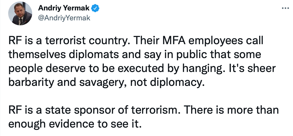 几小时后,乌克兰总统办公室主任安德烈·叶尔马克30日对此作出回应。他在推特上写道:“俄罗斯联邦是恐怖主义国家,他们的外交人员自称为‘外交官’,在公开场合称有些人‘应被处以绞刑’。这是纯粹的残忍和野蛮(言论),而不是外交辞令。俄罗斯是一个支持恐怖主义的国家,有足够的证据证明这点。”