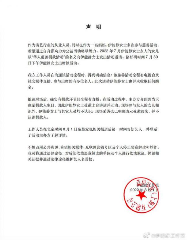 声明中称,伊能静女士是受到友人女儿以“华人慈善捐款活动”为名义的邀请,才来参加的此次活动。伊能静的本意是想为公益活动略尽绵力,且在沟通活动流程时,得到的明确信息是该慈善活动全程有电视台及社交媒体直播,参与出席的有多位名人,伊能静也并未收取任何酬金。