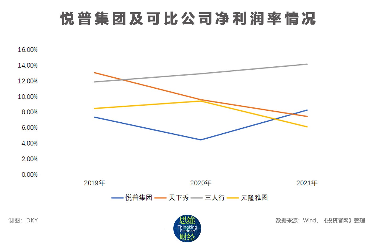 当然,在有效的费用控制下,悦普集团净利润率却在2021年反超了部分可比公司;到2021年公司的净利润率为8.25%,仅低于三人行的14.14%。整体上,悦普集团的盈利能力有所提升。
