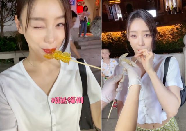 在外面吃小吃的时候,袁姗姗的颜值又仿佛更上一层楼,在夜晚的灯光映照下,袁姗姗的皮肤白的好像发光一样,眼睛非常大,眼神也十分清澈,仿佛盈着一往清水,显得楚楚动人。