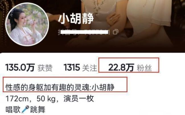 “小胡静”在某平台上拥有22万粉丝,身高172,50公斤,职业是演员,爱好唱歌跳舞。“小胡静”经常晒一些写真照,身材十分火辣。