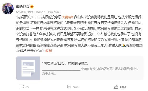 11日,有关山寨男团ESO与杨迪刘维等在长沙同台录制综艺的画面引发热议。12日,“鹿哈”在社交平台发文回应“山寨男团ESO”称号:“我们从来没有觉得我们是网红,从来没觉得我们是山寨,也并不觉得模仿很丢人”,同时他还提到自己模仿鹿晗的原因“我只是希望家里过得更好”。