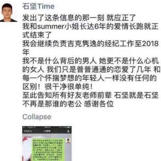 与其互相耗着浪费时间步入快刀斩乱麻尽快结束,刘石坚向吉克隽逸提出了分手,六年的感情就此结束。