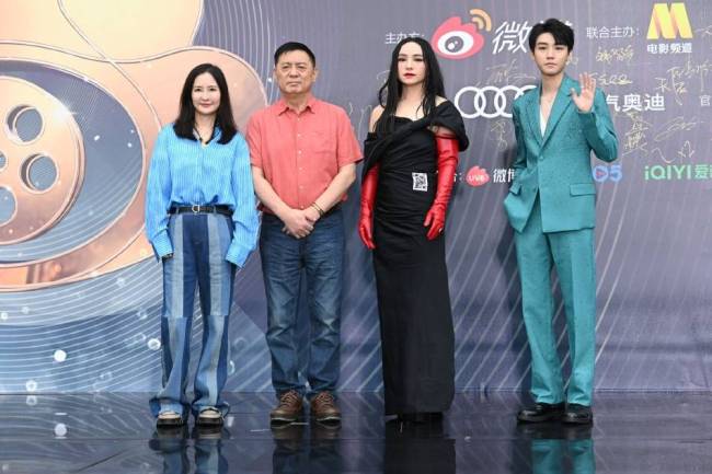 《了不起的夜晚》剧组集体亮相红毯。左起:易小星(监制)、马凯(导演)、范丞丞、王子璇