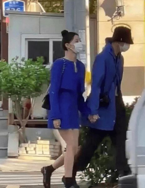 图中姜昇润戴着黑色帽子穿深蓝色外套,与他在街头牵手的神秘女子也穿着同色系的裙子,打扮靓丽,虽然戴着口罩但仍能看出颜值不低。
