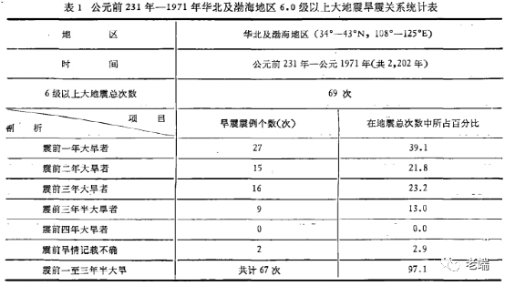 理论已经有了,下面我们来看看能不能联系实际。下面这个表格,从公元前231年(秦始皇十六年)开始,一直统计到公元1971年,在这两千多年时间里,华北及渤海地区总共发生了69次六级以上地震,其中只有两次震前没有出现旱灾,剩余的67次震前都是旱灾。