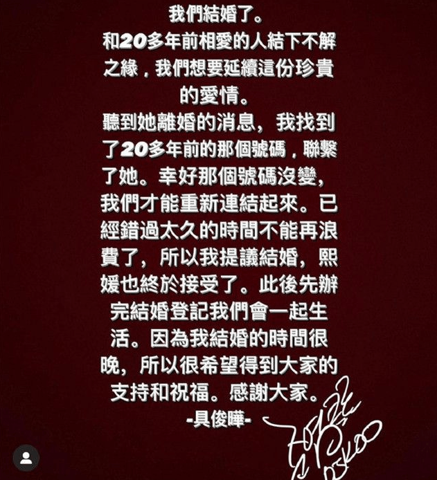 具俊晔表示是在听到大S离婚后,于是就拨通了20年前的号码,没想到还打通了,于是就决定不再浪费机会,并主动提出结婚。