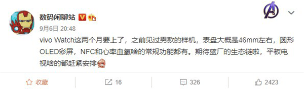 数码闲聊站在微博中表示:“vivo Watch这两个月要上了,之前见过男款的样机,表盘大概是46㎜左右,圆形OLED彩屏,NFC和心率血氧啥的常规功能都有。期待蓝厂的生态链啦,平板电视啥的都赶紧安排。”根据@数码闲聊站微博爆料消息称,vivo智能手表或许已经在来的路上了。