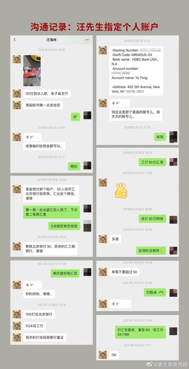 同时波士菁英传媒也晒出与汪海林的聊天记录和转账记录,证明并不存在拖欠稿费等现象,9笔转账超过210万,超过合同约定的总编剧费用400万(含税)的50%。从聊天记录中可以看到,汪海林执意要求打款到他的美国账号上。