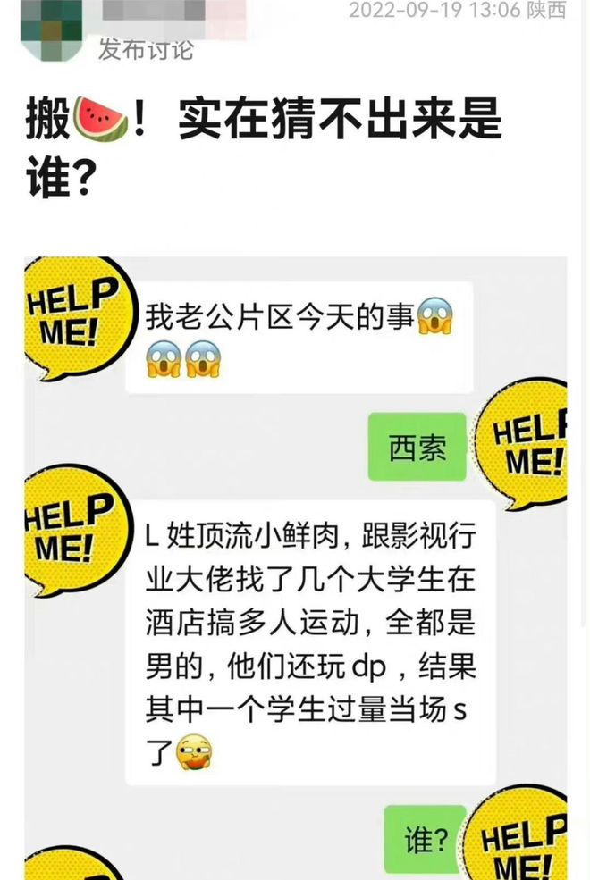 又有人爆大瓜了!一网友突然在论坛发帖,发出了一个惊天大瓜。从网友发出的聊天记录来看,真是信息量巨大。花哥在这里给大家总结一下,就是L姓某小鲜肉顶流和圈里的一些大佬找了几个男学生,在酒店里进行多人运动。甚至还K药,结果玩得太嗨了,其中一个男学生出了问题。虽然L姓是跑掉了,但是剩下的男学生们是全招了。这事闹得这么大,L姓明显离凉凉也不远了。