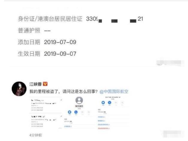 9月8日,江映蓉在微博晒出一张打码的身份信息截图及联系电话截图,透露自己的里程被盗了,同时发文询问航空公司:“我的里程被盗了,请问这是怎么回事”。随后,国航回复称:“已经关注您提及的事情,我们将您的问题反馈给相关部门尽快解决。”