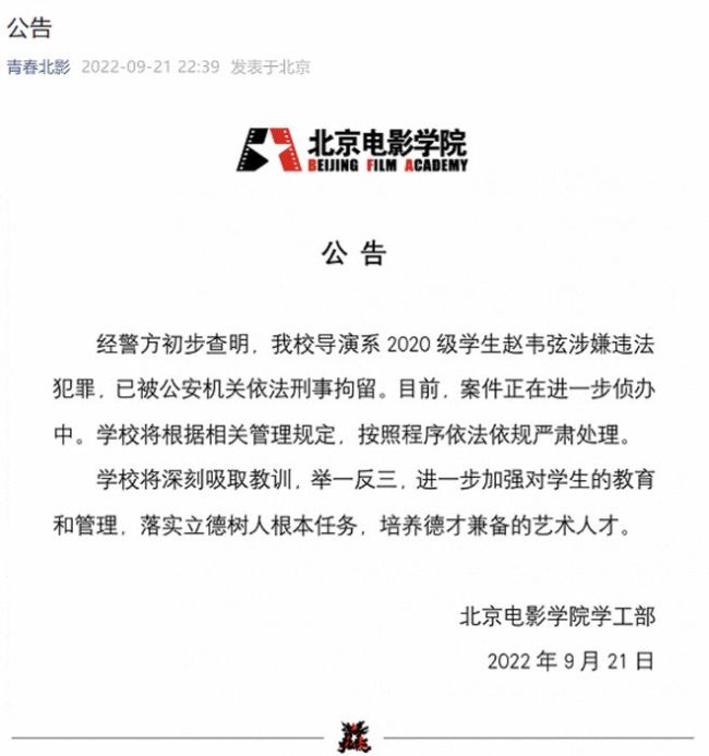 据“青春北影”微信公众号9月21日消息,北京电影学院学工部发布公告称,学校将按照程序依法依规严肃处理。
