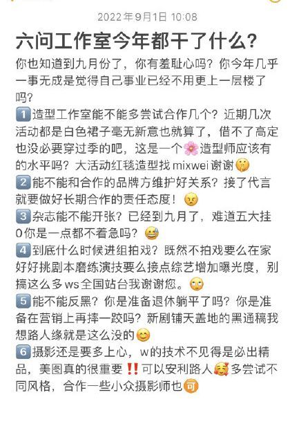 在文中,唐嫣的粉丝对工作室的审美造型、商务杂志、反黑和进组剧本等提出了不满。粉丝表示工作室不仅日常审美造型不在线,还不好好对接商务杂志。